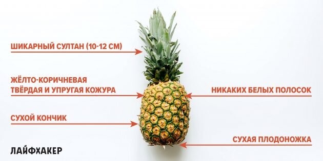 Чтобы правильно выбрать ананас, нужно знать простые «секреты» этого фрукта. Зрелый ананас имеет округлую форму, сухую плодоножку и густой побег (султан) длиной 10–12 см. Глазки — жёлто-коричневого цвета со немного подсохшими кончиками. Меж ними должны быть тёмно-зелёные либо коричневатые бороздки. При выборе ананаса, обратите внимание на кожуру — зелёная кожица гласит о незрелости плода, а бурая либо бордовая — о его порче. Не берите ананас с карими пятнами и белёсыми бороздками. Это признаки гнилости и плесени. Шаг 1. Надавите и постучите Выбрав глазами аппетитный плод, возьмите его в руки. Кожица зрелого ананаса твёрдая и упругая. При надавливании глазки должны проминаться и здесь же восстанавливаться. Если нажали, а вмятина осталась, фрукт начал портиться. Если ананас твёрже кокоса, он ещё не созрел. Ананас весит от 1 до 2 кг. Взяли плод в руки и не ощутили вес? Вам попался залежавшийся фрукт, который уже начал высыхать и, соответственно, терять массу. Положите его на место