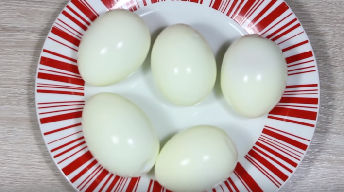 Для этого рецепта нам понадобятся: 5 сваренных яйца Половинка небольшой варёной свеклы Свеклу разрезаем на несколько кусочков И заливаем её кипятком К свекле опускаем отчищенные яйца При необходимости стоит долить воды, чтобы яйца полностью погрузились в воду, накрываем крышкой и оставляем минут на 30 Тем временем, натрём на мелкой тёрке 100 грамм варёной колбасы И несколько грецких орехов Прошло 30 минут и яйца приобрели розоватый оттенок Отрезаем край яйца И достаём желток Добавим 2 желтка к колбасе и орехам, и хорошенько измельчим вилкой Добавим несколько ложек сливочного сыра и тщательно всё перемешаем Перемешиваем всё до тех пор, пока не получится однородная масса Фаршируем яйца получившейся начинкой Возьмём круглую пробку И из кусочка колбасы сделаем кружочки При помощи шпажки сделаем по две дырочки в кружочках колбасы Также нам понадобятся 10 небольших треугольников из всё той же колбасы И 5 вот таких отрезков Наносим на колбасу капельку майонеза И прикрепляем к яйцу Из горошин