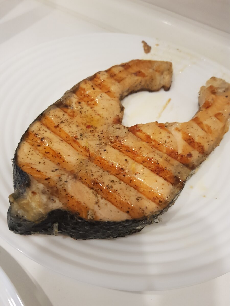 У меня новый канал, ЖМИ а ссылку и подписывайся, будет интересно Да, это не вкусно, это- очень вкусно! Недавно я приобрела замечательный домашний гриль фирмы bork. И теперь очень многое готовлю на нем. Перед этим я изучила наверное все видео на ютубе, что и как в нем готовить. Как думаете, может и канала на ютубе вести с рецептами? И, конечно же, не обошлось без моих идей! Вот, в общем то, сам стейк до манипуляций. Для маринада я взяла соевый соус, оливковое масло, специи. Залила рыбу и оставила на 30 минут. Далее разогреваем гриль до температуры 230, устанавливаем вид мяса и степень прожарки, ставим термощуп в середину одного из стейка, выкладываем на гриль (гриль маслом не мажем!) Накрываем второй панелью! Аромат плывет по кухне просто не вероятный. Даже я, не особо любящая рыбу, однажды подавившись косточкой, захотела как можно быстрее ее попробовать. Готовила для гостей, а сама рыбка лежала с Нового года. Покупала на праздничный стол, но всего было так много, что про нее п
