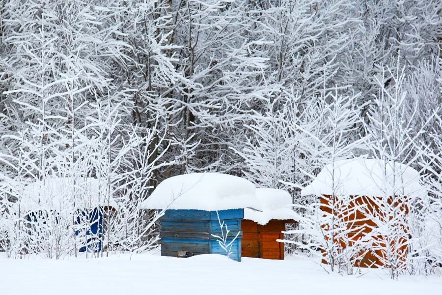 Зимой, когда ульи расположены на улице, а на крышках ульев имеется лед и значительное количество снега, крышку сбрасывают на снег, так, чтобы в нее не насыпался снег. Если будете счищать снег и скалывать лед с крышки, то потревожите пчел, и они могут вылетать и атаковать вас. Поэтому это нужно сделать накануне. Сняв крышку, снимаете утепление и кладете его на крышку. Снимаете осторожно подкрышник. Холстик открывайте от задней стенки со всех рамок.