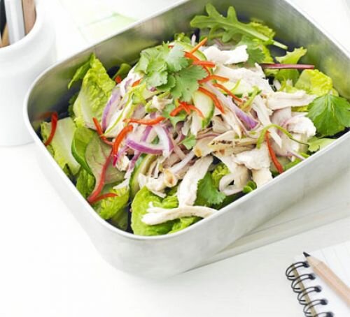 2. Уложите в миску листья салата, кинзу, сверху выложите курицу, лук, чили и огурец. Поливайте салат соусом непосредственно перед употреблением. Приятного аппетита!