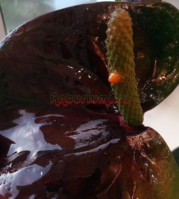 Строение цветка антуриум очень интересно то, что мы считаем цветком, таковым не является. Цветное покрывало, это прицветный лист или прицветник, в природе он служит для защиты самого цветка и привлечения насекомых опылителей. Цветком же является початок, на котором расположены одновременно женские и мужские клетки, женские снизу, мужские сверху. Сложность опыления заключается в том, что созревают эти клетки в разный период времени. Но если опыление всё-таки произошло, то на початке появляются наросты, это завязывается плод, созревает семя. После опыления покрывало начинает сохнуть и быстро увядает. Выращивать ли из этого семени антуриум, решать Вам, но надо помнить, что процесс этот очень долгий и трудоемкий. К тому же неизвестно какое по окраске и размеру растение получится. Антуриумы, выращенные из семени, не сохраняют сортовые качества своих родителей. Источник: https://anturiumi.ru/razvedenie/razvedenie-iz-semyan.html