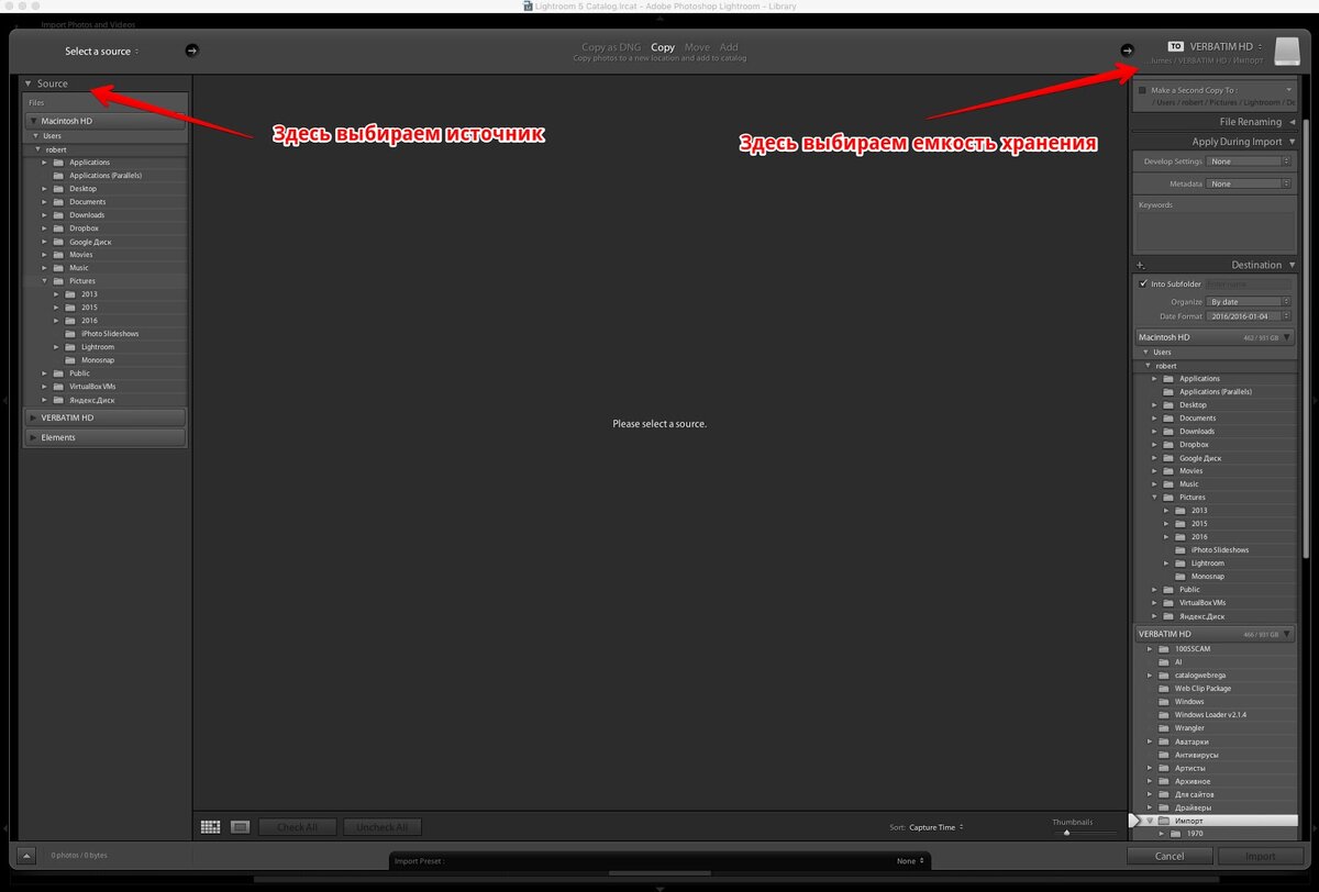 В правом верхнем углу назначаем целевую папку, куда будут копироваться все исходные кадры из источника. В моем случае это папка "Импорт" на внешнем диске VERBATIM HD