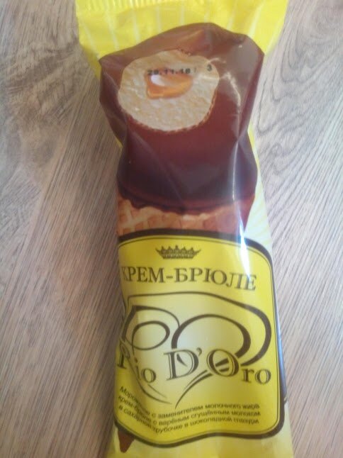 В этот раз в "Магните" купили мороженое крем-брюле Rio D`Oro. Массой нетто оно 70 грамм, стоимостью 18,90 рублей. Ну, что сказать? Не "Коровка из Кореновки",конечно же... Но, тоже вполне съедобное. Немного молочное на вкус, на крем-брюле тоже маленько смахивает. На упаковочке написано,что это мороженое с заменителем молочного жира крем-брюле с вареным сгущённым молоком в сахарной трубочке в шоколадной глазури. Сгущенное молоко ( честное слово ) обнаружить не удалось. Вариантов два - либо его положили в микроскопических ( гомеопатических ) дозах, либо нам просто повезет в другой раз:-) Изготовитель: ООО "Таллосто-3000" ( Ленинградская область,г. Волхов ). ТУ 10.52.10-015-23041591-08. Состав мороженого: сахар, молоко варёное сгущенное с сахаром, молоко сухое обезжиренное, вода питьевая очищенная, масло сливочное, заменитель молочного жира, декстроза, эмульгаторы, стабилизаторы, краситель - сахарный колер III. ( даже комментировать не хочется, почему то... Все вредно, кроме воды, пожалуй