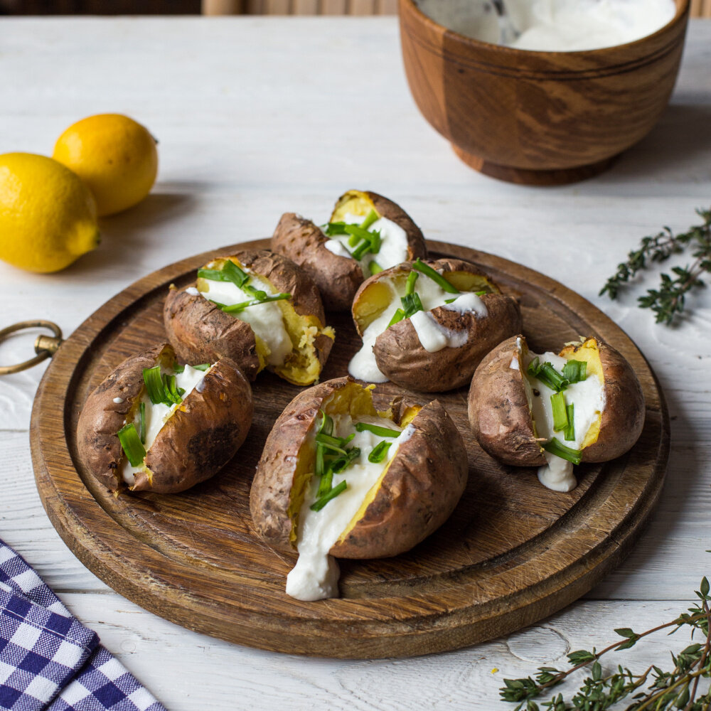 Ингредиенты Тимьян свежий 2 веточки Лимонная цедраот от 1 лимона Картофель 4 шт Соль крупного помола 1 ст.л Оливковое масло по вкусу ДЛЯ КРЕМА ИЗ ФЕТЫ Фета 150г Сметана жирная 4 ст.ложки Оливковое масло 4 ст.ложки Лимонный сок 50мл Соль1 щепотка Перец черный молотый по вкусу Шнитт-лук 1. Разогреть духовку до 200 градусов. Отдельно размолоть (или измельчить с помощью ножа) смесь: свежий розмарин, тимьян, цедра 1 лимона, крупная соль. 2. Выложить смесь на противень для запекания. 3. Картофель промыть и обмокнуть бумажным полотенцем. Проткнуть картофель вилкой со всех сторон, выложить на противень со специями, смазать оливковым малом и отправить в разогретую духовку на 60 - 75 минут. 4. Приготовить крем из феты: сыр фета размять ложкой и смешать в миске со сметаной. Добавить оливковое масло, лимонный сок, соль и черный перец по вкусу. 5. Готовый картофель разрезать посередине, выложить крем с фетой, посыпать порезанный шнитт-лук P.S. Подаем картофель теплым!