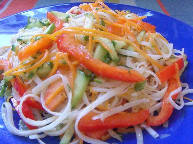 Лично я обожаю рисовую лапшу. Она легко готовится, прекрасно сочетается с овощами, мясом и морепродуктами, да и ваш желудок скажет вам спасибо. Сегодня я расскажу о простом способе приготовления этого продукта. Этот вариант прекрасно подходит вегетарианцам и тем, кто сидит на диете (рисовая лапша низкокалорийная). Нам потребуется: Лапшу нужно положить в прохладную кипяченую воду и оставить замачиваться на 8 минут. В это время морковка и болгарский перец режутся соломкой, а лук тонкими полукольцами. Затем холодная вода с лапши сливается и заливается кипяток. Также минут на 8-10. После этого все промывается в дуршлаге. Разогрейте хорошо сковородку с оливковым маслом (3 ст.л), выложите на нее лук и морковь и жарьте около 1-2 минут. Затем добавляете туда половину болгарского перца и жарите еще пару минут. Овощи не должны стать мягкими. Затем смешиваете лапшу с овощами. Далее, для придания кислинки, нужно сделать маринад. В 100 мл холодной кипяченой воды добавляете соль и лимонный сок. В
