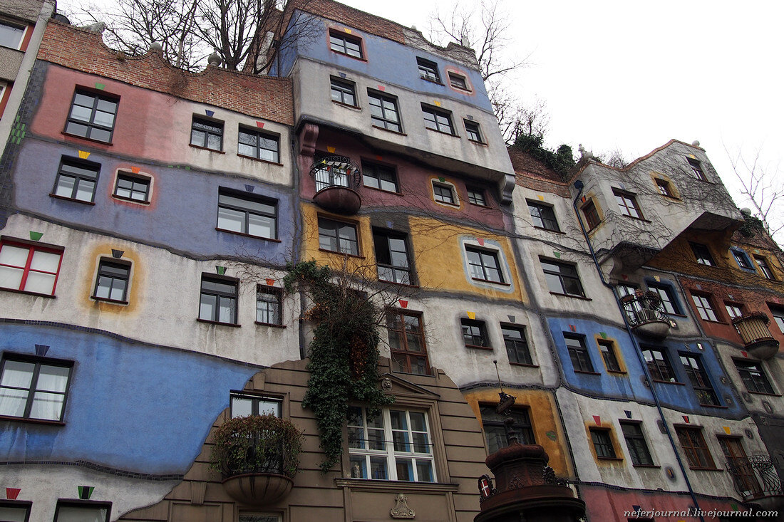 Вот он, знаменитый Дом Хундертвассера. Яркий фасад и беспорядочное расположение окон. Хундертвассер является основателем биоморфного стиля в архитектуре. В его домах нет прямых линий, окна разного размера, подоконники закруглены. Даже дорожки вокруг дома изогнутые. Как будто улица сошла с ума. Просто взрыв мозга.
