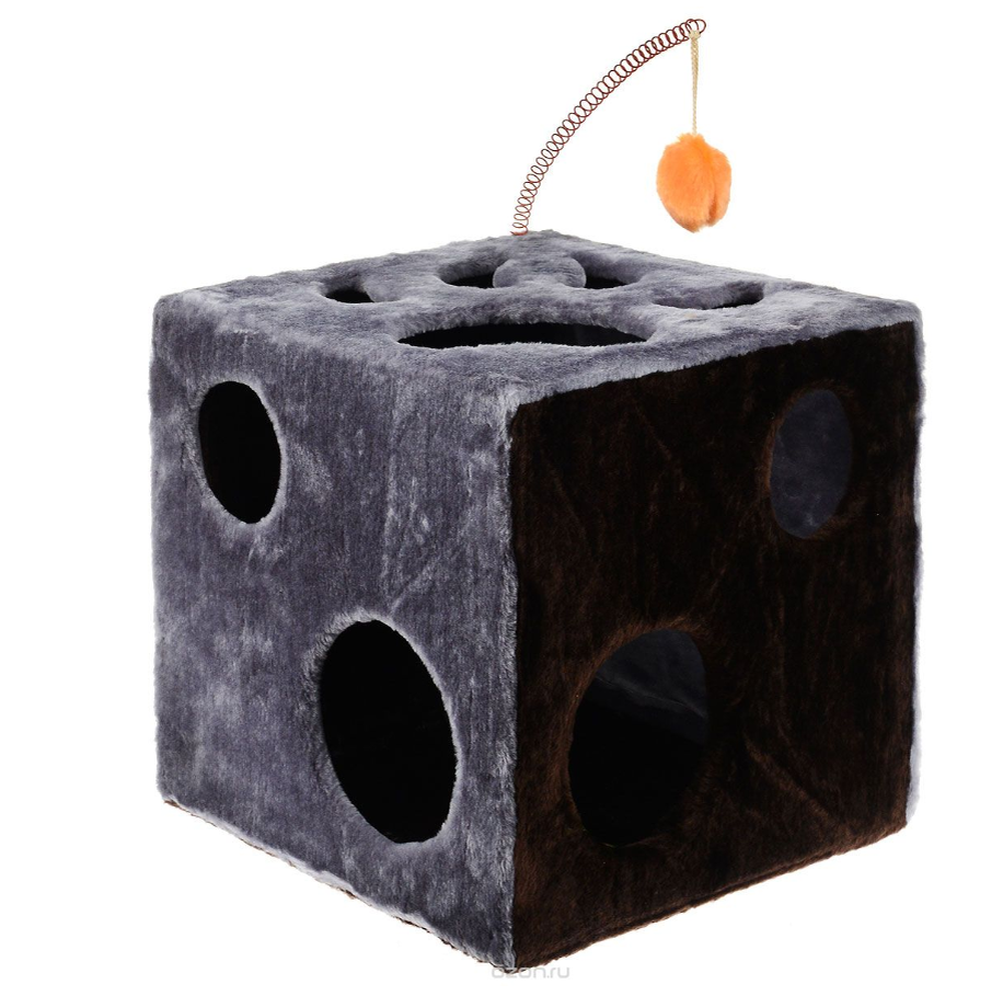 Навигация по другим обзорам кошачьих игрушек - ЗДЕСЬ... 6. Домик для кошек ЗооМарк "Кубик с лапкой" Обошелся нам в свое время за 1039 рублей (сейчас стоит также). Этот кубик наши коты любят. Они устраивают свои кошачьи игры, одна из которых, любимая ими, называется "цапни товарища за пятую точку". Сверху сидит один кот, прям попой на отверстии, а внутри второй, и тот второй кот норовит полапать, или того хуже - цапнуть, первого за откормленную пушистую за... за попу, короче :))) Второй ПРОТИВ такого расклада и лупит лапой сидящего внизу. Эта игра может продолжаться довольно долго, пока верхний кот, чрезмерно свесившись, чтоб отвесить оплеуху нижнему, не потеряет равновесие и не свалится вниз :))) Когда котик был у нас в единственном экземпляре, он также очень активно пользовался кубиком, особенно с приделанным вверху шариком: сидел внутри и пытался его внутрь утянуть. Шарик может и хотел "утянуться", но его не пускала пружина))) В итоге, кот мог подолгу играть в эту увлекательную