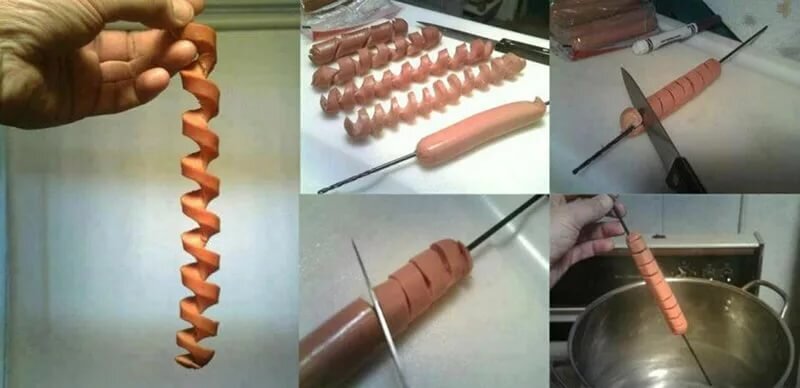 Ингредиенты: 6 сосисок; 40 г сливочного масла; овощи, салатные листья, кетчуп для подачи. Способ приготовления: Сосиски почистить от шкурки, а затем порезать, 1 вариант «спираль»: сосиску насадить на палочку для шашлыков, острым ножом, постоянно вращая палочку, прорезать спираль до палочки. Убрать шпажку и обжарить наши сосиски на раскаленном сливочном масле со всех сторон. После обжарки получится «пружинка». 2 вариант «осьминоги»: для этого необходимо надрезать сосиску с одной стороны до середины крест накрест, а затем также обжарить на растопленном сливочном масле до румяности. 3 вариант «гусеница»: по всей длине с одной стороны делаются поперечные надрезы примерно на треть глубины сосиски с одинаковым расстоянием и обжарить до золотистого цвета. 4 вариант "медуза": разрезать с двух сторон , практически до середины, как осьминоги и жарить на сковороде. 5 вариант "ёлочка": с двух или трех сторон на одинаковом расстоянии сделать надрезы под углом. На сковороде со сливочным м