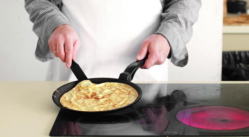 На среднем огне разогрейте сковородку, смажьте маслом, зачерпните тесто. Свободной рукой возьмитесь за ручку сковороды. Одновременно приподнимите один край сковородки примерно на пять сантиметров — и начинайте лить тесто приблизительно в ее центр. Едва первые капли теста коснутся сковороды, начинайте плавно поворачивать ее по окружности, чтобы тесто растекалось равномерно. Здесь важно понять (или скорее почувствовать), как соотносится густота теста со скоростью его движения. При указанном соотношении муки, яйца и молока тесто получается довольно густое, оттого движется не очень быстро. Правда, и блины выходят не особенно ажурные.