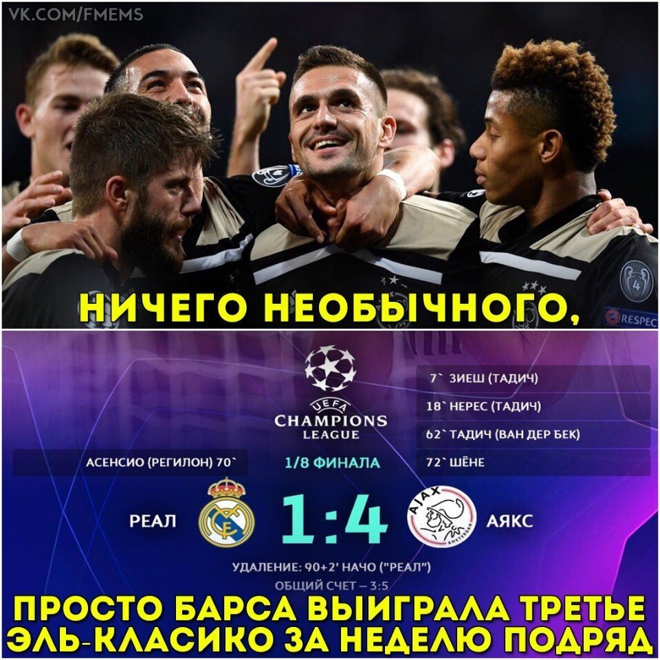 Реал знатно опозорился, крупно проиграв дома Аяксу и покинув турнир на стадии 1/8-й финала! Ну а мы постараемся увековечить эту "эпику" забавными мемами! 1) Аякс ну прям очень похож на Барсу по стилистике ведения игры! 2) Не недооценивайте Криштиану 3) Клубы, которые знают как унижать Реал... 4) Дыркуа в деле 5) Лучше и не скажешь! 6) Как-то так... 7) Главные тащеры Реала уже не могут помочь... 8) Просто красавцы! 9) Как ему удается ещё оставаться тренером Реала? :))) Посмеялся немного? Отлично! Тогда подписывайся и ставь лайк!