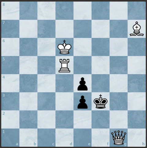 Шахматная задача. У черных две сдвоенные пешки, одной из них два хода до Ферзя. Белые начинают и ставят мат в 2 хода. Подпишитесь на канал и будет много новых, интересных задач. Решение публикую далее 1. Слон g6. 1. ... если черные идут пешкой е2. 2. Ладья f5 мат. Подпишитесь и будет много новых, интересных, познавательных задач. задача 59 тут>>>задача 60 тут>>> задача 61 тут>>> задача 62 тут>>> задача 63 тут>>> задача 64 тут>>> задача 65 тут>>>