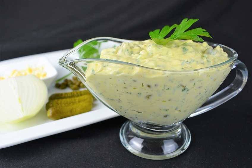 3. Измельчите маринованные продукты (грибы и огурцы), перья зеленого лука и вареные белки. Переправьте в основу татарского соуса.