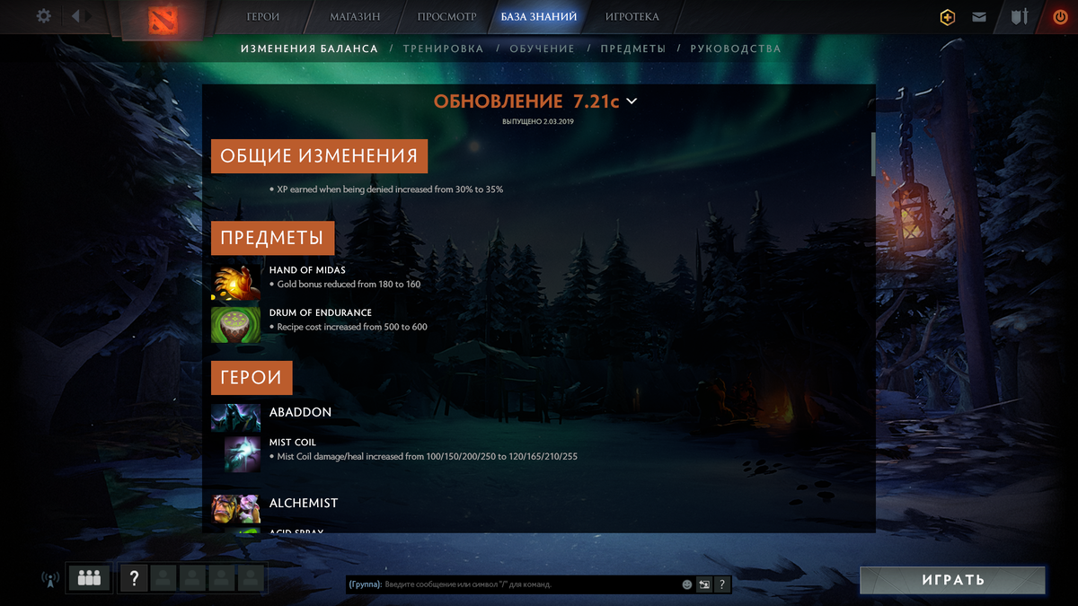 3 марта вышло обновление для клиента.Самые важные ребалансы мы сейчас рассмотрим. 1) Самое главное это фикс мидаса Бонусное золото уменьшено со 180 до 160 монет. Безусловно этот фикс напрашивался для разработчиков,так как на про сцене и в пабликах в одной команде можно увидеть 3-2 мидаса,что заставляло игру идти пассивнее. 2)Бафнули такого героя ,как Аппарат,всеми забытый герой *Прирост интеллекта увеличен с 3 до 3.4 *Длительность Ice Blast(ульт) с 9/10/11 до 10/11/12 секунд 3) Kunkka: Tidebringer больше не увеличивает урон по союзным существам(то есть не дает доп.дамаг при добивании союзных крипов,раньше давал дамаг и не было кд) 4)Lina на протяжении всего 7.20 поднимают героя. Изменены таланты на 20 уровне *Уровень 20: бонус за заряд Fiery Soul увеличен с 25/2 до 30/2% * Уровень 20: бонус к урону от способностей увеличен с 12 до 14% 5) Monkey King: Mischief больше не дает неуязвимость, а делает вас невосприимчивым к урону 6) Viper Прирост ловкости снижен с 3.3 до