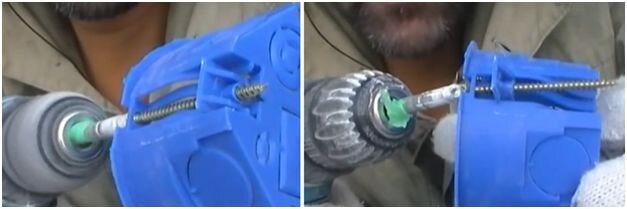 В подрозетнике выкрашивается один из входов для проводов, и в него вставляется выведенная из гипсокартона гофра с кабелем. Коробка вставляется в гнездо и вращением винтов прижимных лапок фиксируется по месту.