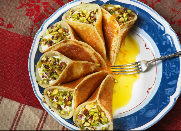 ИНГРЕДИЕНТЫ Пшеничная мука 130 г Молоко 200 мл Изюм 2 столовые ложки Кешью 2 столовые ложки Соленые фисташки 2 столовые ложки Топленое масло 50 г Сахар 3 столовые ложки Сухие дрожжи 1 чайная ложка Разрыхлитель ½ чайной ложки Соль щепотка Сливочный творог 400 г ИНСТРУКЦИЯ ПРИГОТОВЛЕНИЯ 1. В стакан теплой воды добавить дрожжи и сахар, размешать. Влить теплое молоко, постепенно всыпать муку с разрыхлителем и солью, тщательно перемешать миксером. Дать постоять несколько минут. 2. Разогреть на среднем огне сковороду с антипригарным покрытием — без масла, сухую. Аккуратно вылить на середину сковороды половинку половника с тестом: должен получиться блинчик диаметром 10–12 см. Жарить блинчики нужно только с одной стороны — до тех пор, пока верхняя сторона не станет сухой и матовой. 3. Готовые блинчики выложить на плоскую поверхность. Каждый сложить пополам и пальцами защипать его края до середины — так, чтобы получились кулечки. 4. Смешать сливочный творог, изюм и рубле