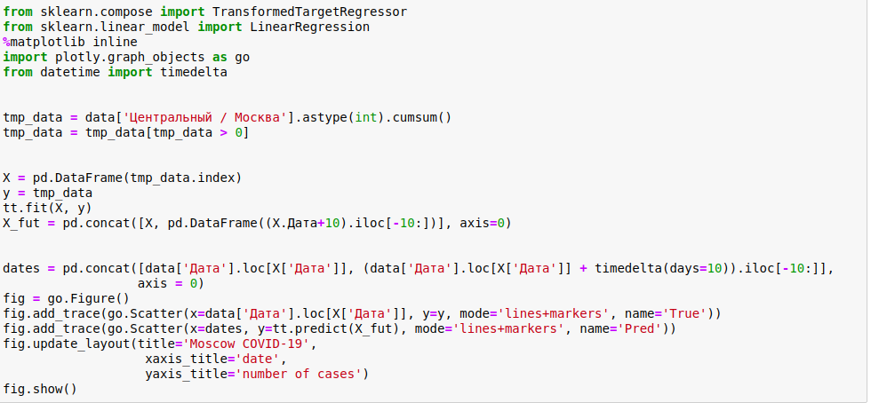 Меня зовут Дмитрий. Я работаю главным специалистом по машинному обучению в страховой компании Альянс Жизнь. Ввиду того, что вся Москва на карантине, то я решил попробовать использовать разные методы машинного обучения для предсказания течения эпидемии. Начну с того, что это первая статья из серии, поэтому будут лишь простые прикидки. Утв 1. Москва относительно недавно стала заражаться, число заражённых составляет малый процент популяции. Предположительно, число заражений будет расти по экспоненте. Ввиду долгого инкубационного периода, принятые решения власти будут влиять на график с задержкой. Утв 2. Скорее всего, в ближашие 10 дней ситуация продолжит развиваться по экспоненциальному закону(затухания показателя экспоненты не будет, так как вирус потенциально может передаться очень многим, в силу того, что сейчас заражен минимальный процент популяции), поэтому единственное влияние на экспоненту будет оказывать начавшаяся неделю назад удалённая работа, которая была призвана замедлить