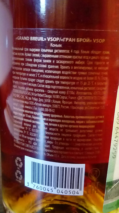 Данная статья содержит сведения об алкоголе. Предупреждаю, чрезмерное употребление алкоголя вредит вашему здоровью Мои читатели, всем привет! Продолжаем знакомиться с французскими коньяками категории VSOP. Очередная дегустация посвящена коньяку Grand Breuil VSOP. Обзор от моего друга Александра (текст и фото автора, ссылка на оригинал в конце обзора). Не знаю как получилось, но у меня сложилось предубеждение относительно недорогих коньяков выпускаемых Дистиллерией Тессендье. В свое время и Park vsop, не произвел особого впечатления, может момент был неподходящий. В предновогодней закупочной суете в Магните выдавали что-то типа лотерейных купонов, где стерев защитное поле как правило можно было обнаружить скидку на покупку в январе. Запомнилась скидка 35% на Старейшину 5 лет, купон я отдал товарищу по работе и скидка 500 руб. при чеке на покупку не менее 2000 руб. После праздничных застолий, к еде появилась прохладца, но вот 31 января в последний день когда можно было воспользоватьс