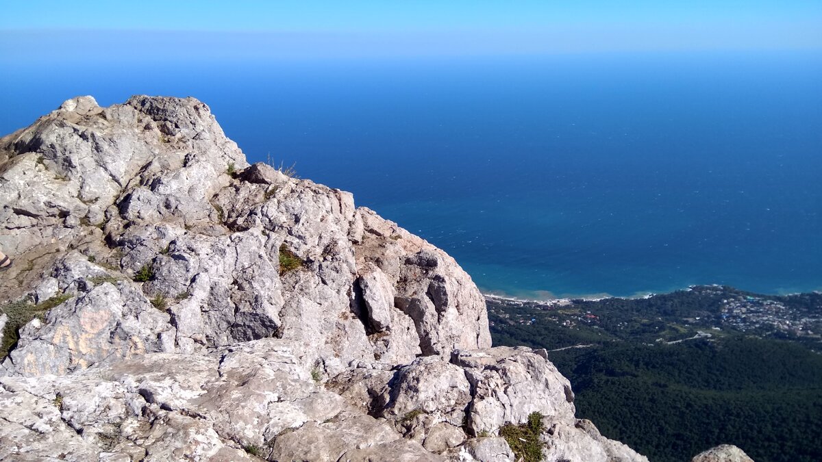Самым запоминающимся местом в Крыму для меня стала гора Ай-Петри. Ее высота составляет 1234 метра на уровнем моря. Покорять ее мы решили на машине. Дорога идет через лес. Она местами была такая узкая, что не получалось разъехаться со встречными машинами. Приходилось то и дело останавливаться или вообще сдавать назад. Очень крутые повороты и обрывы. Местами страшновато. Есть еще канатная дорога. Но она, вроде как, не работала на тот момент. Слышал, что некоторые забирались на гору пешком. Не представляю как это трудно и долго, если на машине это заняло почти час. Наверное, на такие подвиги решаются подготовленные люди. Добравшись, мы поняли что оделись не по погоде, так как на возвышенности было значительно прохладнее, чем в городе. Оставили машину на парковке, мы продолжили подъем пешком. Недалеко от парковки даже была организована ярмарка. Можно прикупить сувениров и перекусить. Но мы не стали задерживаться и пошли на смотровую площадку. Идти пришлось несколько сот метров по камням.