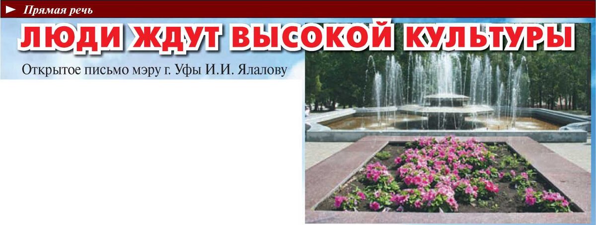 Позвольте мне, как человеку, который не первый год работает в сфере культуры, поделиться своими соображениями о том, как нам обустроить эту самую культуру в городе. Думаю, вам постоянно докладывают о состоянии ЖКХ, электросетей, теплоснабжения, водоснабжения, автодорог, внутридомовых территорий, вплоть до озеленения и ночного освещения в городе. Докладывают ли вам о состоянии культуры в городе? Например, о том, как идет подписка на газету «Истоки», единственную в республике газету, освещающую вопросы культуры, все знаковые мероприятия, публикующую стихи и прозу городских и республиканских авторов, рецензии на культурные события, проповедующую уфацентризм — любовь к родному городу?