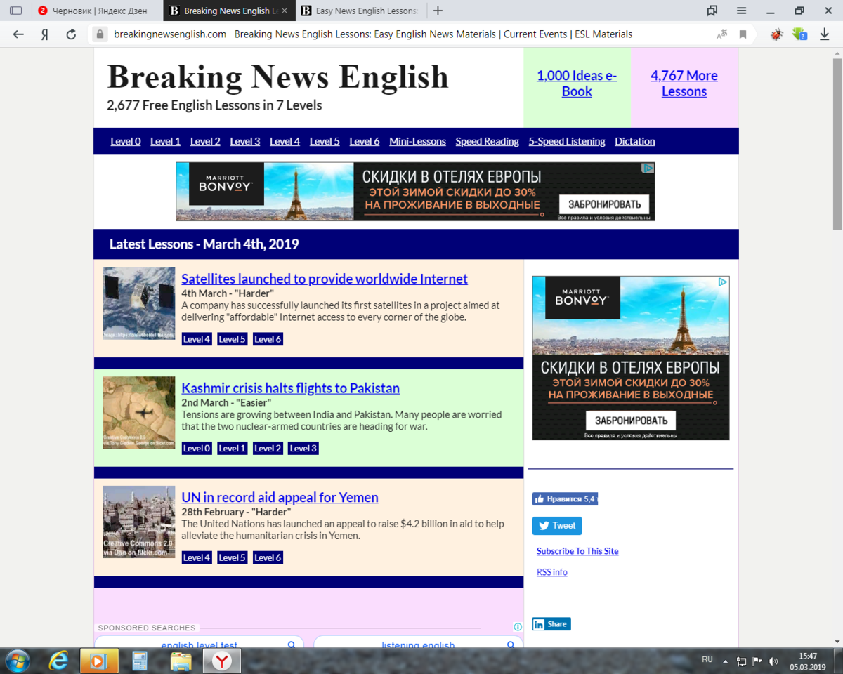В этой статье я бы хотела рассказать вам о таком интересном ресурсе для изучения английского языка, как Breaking News English. Среди моих коллег мало кто им активно пользуется, а зря! Современный контент, актуальная лексика, уровневая подача текстов, разнообразные упражнения на отработку лексики, грамматики, навыков аудирования и говорения, интерактивные задания - всё бесплатно! Только работай! Сортировать статьи вы можете по уровням: На каждой странице определенного уровня представлен общий список статей; можно подобрать материал по заголовкам (с помощью Shift+F3 делается подборка по ключевым словам): К каждой статей уже создан комплекс упражнений: Есть аудиозапись статьи и задания: Если нет возможности работать перед монитором, то для многих статей подготовлен вариант в форме 2-page MINI lesson в формате pdf (можно распечатать на 2 страницы на 1 листе в качестве раздаточного материала для групп): Я часто использую эти разработки при работе со студентами в рамках блока по обучению реф