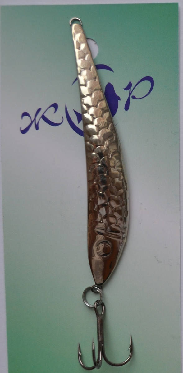 Отвесная зимняя блесна Жор Тюлька Э - приманка спаяна вручную в сочетании однотипных отштампованных коронок – нейзильбер, рандоль, латунь. Кривизна тела этой блесна на судака зимой вся та же, оригинальная, поэтому позволяет уходить в сторону, плавно колеблясь на сбросах, что также привлекает речного хищника