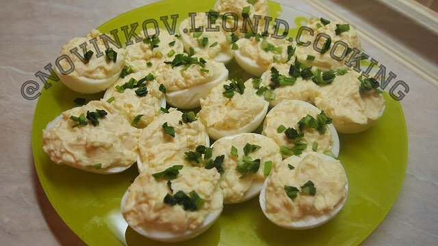 3. Выкладываем начинку в половинки яиц, если есть кондитерский мешок или плотный полиэтиленовый пакет это очень хорошо. Кладите начинку в пакет и выдавливайте в сердцевину. 4. Посыпаем укропом или как я зелёным луком и готово ✅ Приятного аппетита😉 Не забывайте подписываться на канал и ставить лайки )