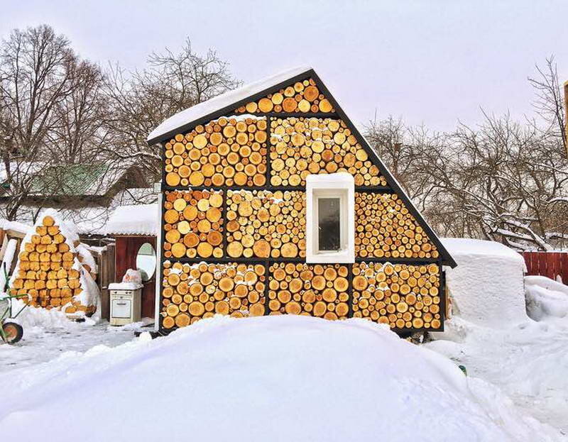 Этот проект с бюджетом 137.000 рублей стал победителем ежегодной архитектурной премии Arhiwood в номинации «Малый объект». Задача, поставленная Романом (заказчиком), заключалось в том, чтобы построить небольшой гостевой дом (общей площадью 17 квадратных метров), который на время строительства основного дома, можно было бы использовать в качестве бытовки для рабочих. Дом должен был стоить меньше 150 тыс. руб., быть спроектирован и сделан в течение двух недель и иметь интересный архитектурный облик, так как находится на достаточно заметной части участка. Фасад дома, помимо ограждающей и эстетической функции, служит ещё и для хранения. Ячейки-полки заполнены дровами различных пород дерева. Дрова на нижних полках могут быть действительно использованы для мангала, кроме того, они создают интересную интригу между хозяином и его жильем, часть которого он будет сжигать и обновлять каждый год. Итоговый бюджет объекта. Доски – 2 куба: 15.000 руб. Утеплитель «Изовер» – 17.000 р. Плиты ОСБ – 10
