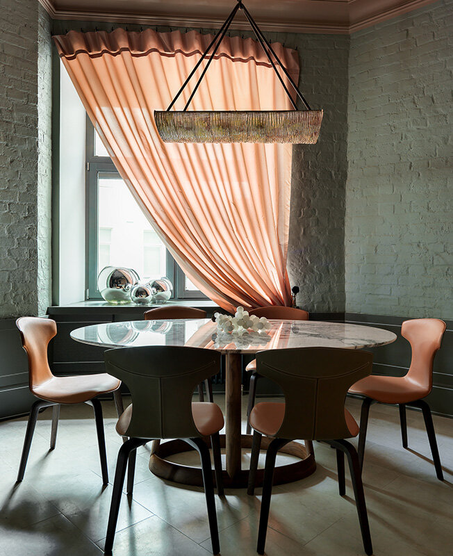 Шторы — самый главный текстильный компонент в доме. Если окно в комнате сравнивают с глазами на лице, то его декор — с «макияжем», который может «лицо» украсить, а может и наоборот. По теме: Ковер в гостиной и столовой: 80 примеров :Всегда ли окно нужно акцентировать? При хорошей минималистской архитектуре, интересном пространстве, которое хочется подчеркнуть, шторы должны быть максимально спокойными, возможно, даже в цвет стен. Когда же в архитектурном плане похвастаться нечем, а в наших домах чаще всего так и бывает, лучше повесить на окно нечто заметное. Яркий цвет и орнамент на шторах привлекают внимание к окну и отвлекают от всего остального. К крупному орнаменту в компаньоны выбирайте что-нибудь однотонное или полосатое, тогда ткани не будут спорить между собой. Чем сложнее ткань, тем он должен быть проще. И наоборот, красота простого льна набирается ритмом складок. Так что решайте: покупать ли сотню метров льна или десять — парчи. И то и другое может быть красивым. Чем дороже, к