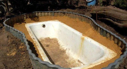 Первым делом нужно выкопать яму под ванну. Далее ванна устанавливается в яму, и маскируются края. Затем нужно вырезать из листов металла или пластика вставки и зафиксировать их вокруг ванны, чтобы хорошенько укрепить ее и защитить от брызг воды края.