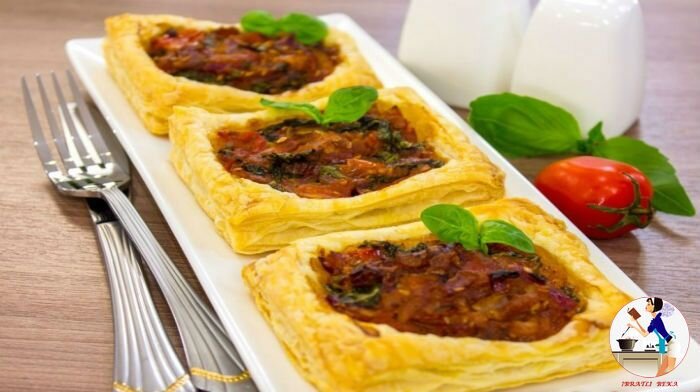 Bu juda ham mazali! Qarsildoq xamir, hushbo'y asos chinakam lazzatlanishni taqdim etadi. Vaqtingiz ziq bo'lib turgan vaqtda tamaddi qilib olish uchun ajoyib tanlov. Juda ham tez tayyorlanadi. Taomnoma uchun yangilik. Ushbu retseptni albatta sinab ko'ring! Kerakli masalliqlar: 500 gramm tayyor qavatli xamir 450 gramm pomidor 250 gramm piyoz Rayhon ko'kati Tuz, murch va o'simlik yog'i Tayyorlash usuli: 1. Tozalangan piyozni mayda, somoncha shaklida to'rg'ang. 2. Pomidorni mayda shaklda to'rg'ang. 3. Rayhon ko'katini maydalang. 4. Tovada qizdirilgan yog'da avval piyozni quvuring. 5. Pomidorni soling va 3-4 daqiqa davomida dimlang. 6. So'ng, tuz, murch va rayhon ko'katini soling. Aralashtiring va olovdan oling. 7. Pergament yozilgan pishirish qolipiga xamirdan 10x10 sm hajmda shakllar kesib, terib chiqing. 8. Xamir chetidan 1 sm qoldirgan holda, xamir shaklini yo'qotmay kesib chiqing. 9. Tayyorlangan asosni ortiqcha sharbatidan ajratib oling. Kesilgan xamir bo'laklariga asosdan soling. 18