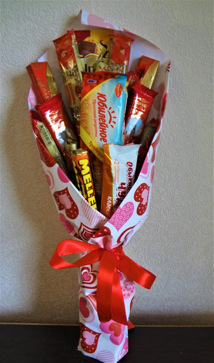 Скоро уже наступит самый прекрасный праздник весны. Я покажу Вам как недорого и быстро сделать оригинальный подарок для Ваших близких и любимых. Нам понадобится: - Шоколадка 1шт. - Печенье и батончики (у меня это козинаки 4шт., батончик пористого шоколада2 шт., батончик «Бабаевский» 2шт., Meller 1 шт., «Обыкновенное чудо» 1шт., печенье «Юбилейное» 1 шт., конфеты «Батончик №1» 4 шт.) Вы можете взять любые другие, которые у вас есть и подходят по цвету и размеру. -Шпажки (продаются в отделах для пикника или хозяйственных магазинах) -Скотч -Атласная лента -Упаковочная бумага Процесс: 1. Разворачиваем один хвостик конфеты и закручиваем в него шпажку. Все это крепим скотчем (по всей длине шпажки обматывать скотчем не нужно, главное просто закрепить). Так делаем со всеми конфетками. 2. К обратной стороне батончиков прикладываем одну шпажку и закрепляем скотчем. Так делаем со всеми небольшими батончиками. 3. Большую шоколадку и печенье закрепляем, так же скотчем, но на две шпажки, что бы