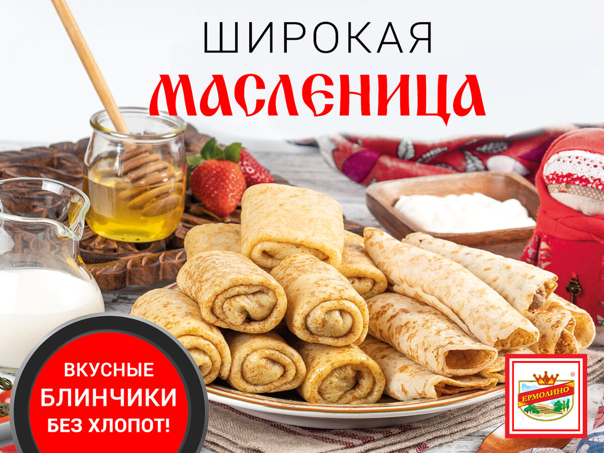 Уникальный блинный календарь из готовых блинчиков. Старинные традиции на современный лад. Каждый день станет особенным! И самый хладнокровный человек любит горячие блины. Народная поговорка Отмечаем Масленицу с блинным календарем ТМ Ермолино! На каждый день мы рекомендуем свои фирменные блинчики. Понедельник - Встреча. Блинчики "Домашние" с мясом. Самая любимая начинка для всей семьи. Вторник — Заигрыш. Блинчики с печенью. Особенно вкусные и ароматные. Отличный повод порадоваться приходу весны. Среда — Лакомка. А здесь уже и придумывать не нужно. Три вида блинчиков «Лакомка» в магазинах ПРОДУКТЫ ЕРМОЛИНО. Выбирайте на свой вкус! Попробуйте со сгущенкой!