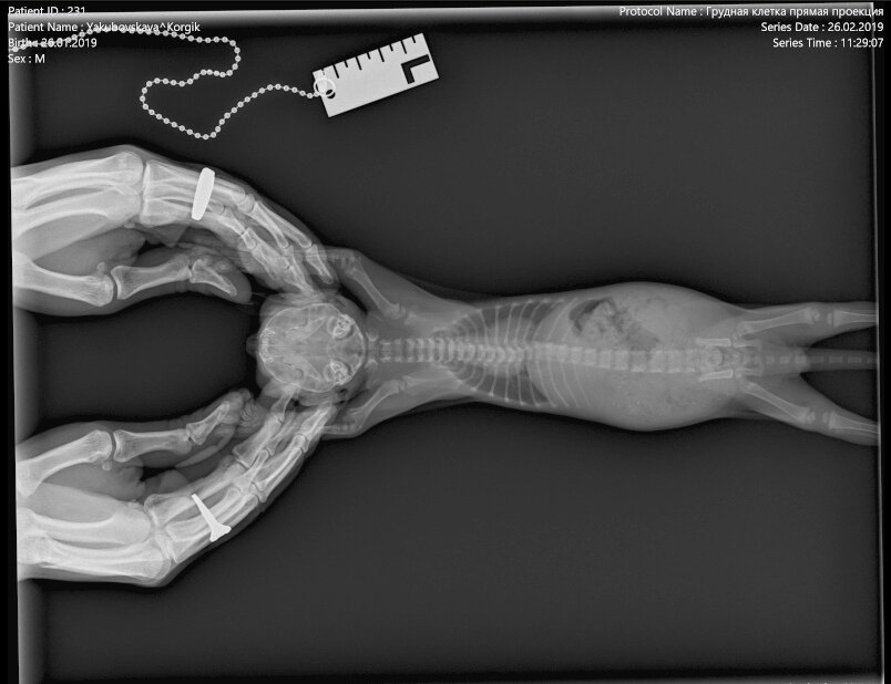 Марина показала Коржика специалистам, был еще рентген, без этого было не обойтись. Алла не присутствовала при осмотре и рентгене, передавала услышанное Мариной и оформленное доступно для нее самой, не знаем, как для Вас. Котенок Коржик будет богатырем: аппетит отличный! Проблемы у Коржика со спиной врожденные, генетические (как сразу и предполагалось нами - выбраковка породы!). Очень низкая плотность костной ткани, есть ущемления в позвоночнике.