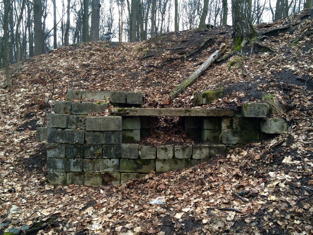 Это ДОТ- долговременная огневая точка. Расположен на склоне нависающем над рекой. Построен по необычному принципу из бетонных «кирпичей» соединённых арматурой. Состояние не ахти.