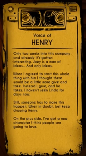 Проигрыватель с записью Генри может быть найден в затопленной комнате, которую он записал спустя две недели после открытия студии. В ней Генри рассказывает о Джоуи как о человеке «идей», и что огромное количество работы, взвалившейся на плечи Генри не позволяет ему видеться с Линдой. В конце аудио-дневника он говорит, что придумал нового персонажа, который должен понравиться людям.