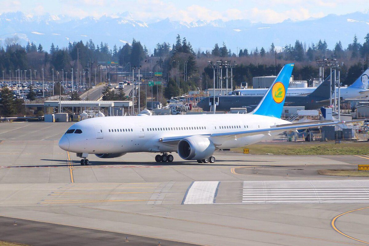 UK78705 для Uzbekistan Airways в Эверетте после выкатки со сборочной линии на заводе Boeing проходит первые испытания на земле.