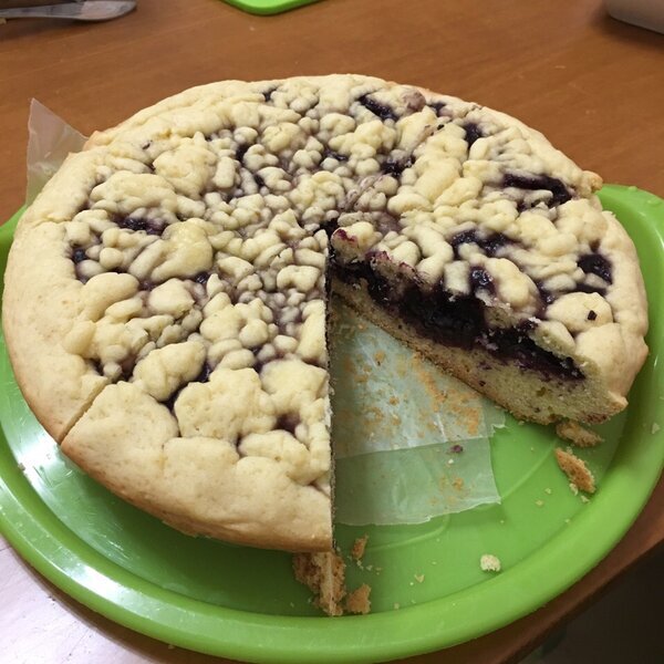 Ситуация: привезла мне тетя ягоды, перетертые с сахаром...а их никто не ест...И решила я испечь пирог...и, о Боже, это вышло ооооочень вкусно... Ингредиенты: 2 яйца - 14 рублей Сахар 150 гр- 10 рублей Мука 350-400 гр- 15-20 рублей Маргарин 120 гр - 36 рублей Сода или разрыхлитель - 1 чайная ложка (если у вас соды дома нет, у меня плохие новости, скорее всего ваш дом находится в аварийном состоянии) И собственно 150 гр. ягод с сахаром или варенья. Если субстанция с ягодами очень жидкая, можно добавить 2 чайные ложки муки. Или вообще заменить на другую начинку (бананы, тертые яблоки, пепел...) Итак...взбиваем яйца с сахаром, добавляем порубленный ножом маргарин, туда же соду и муку. Замешиваем тесто. Кладём в пакетик, убираем в холодильник на полчаса. Далее делим «колобка» на 2 неравные части, примерно 1/3 и 2/3 от общей массы. Я готовила в мультиварке, можно и в духовке- не принципиально. Из бумаги для выпечки вырезала 2 полоски шириной примерно по 10 см , смазала чашу маслом , уложи