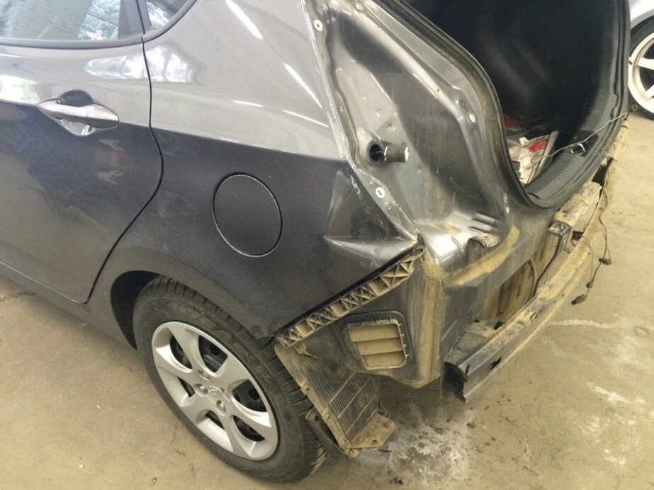 Hyundai Solaris — ремонт и окраска заднего левого крыла, а также окраска заднего бампера.