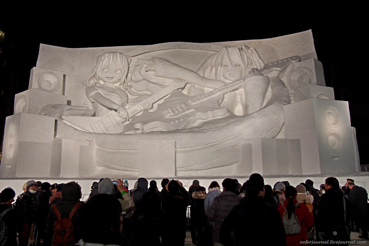 Обратите внимание на размеры. Перед скульптурной композицией стоят люди, можно сравнить. Объект называется "Hard Rock Family Live - Hatsune Miku & Kasumi Toyama on Snow Stage". Хацунэ Мику - виртуальный персонаж, аниме-певица, еще одно название - вокалоид. В реальности ее не существует, однако проводятся живые концерты. Хацунэ Мику собирает стадионы! Впервые я узнала о ней из программы "Орел и решка". Касуми Тояма - героиня аниме BanG Dream!, гитаристка группы Poppin' Party. Видимо тоже популярна, поэтому на фестивале их объединили в единый ансамбль. Скульптурную композицию соорудили военные. На самом деле в Японии армии нет, это называется наземные силы самозащиты.