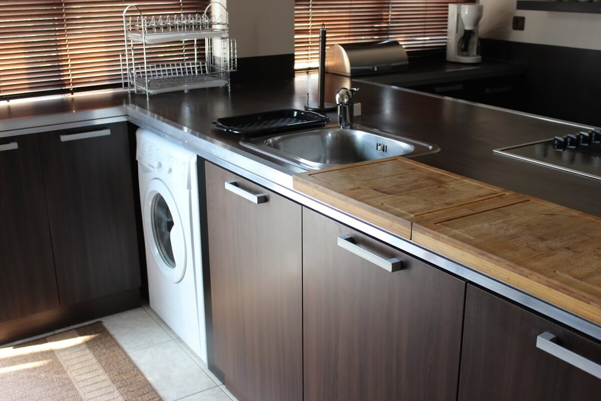 Кухня-столовая - достаточно распространенный в Болгарии вариант. Но нам досталась просто большая кухня. На этом фронте оборудование - стиральная машина, посудомоечная машина. Для горячей воды - проточный нагреватель, прямо тут. Плохонький, к сожалению, но это несмертельно при наличии посудомойки. Посудомойка небольшая, не встроенная, просто поставлена в шкаф. Кондиционер.
