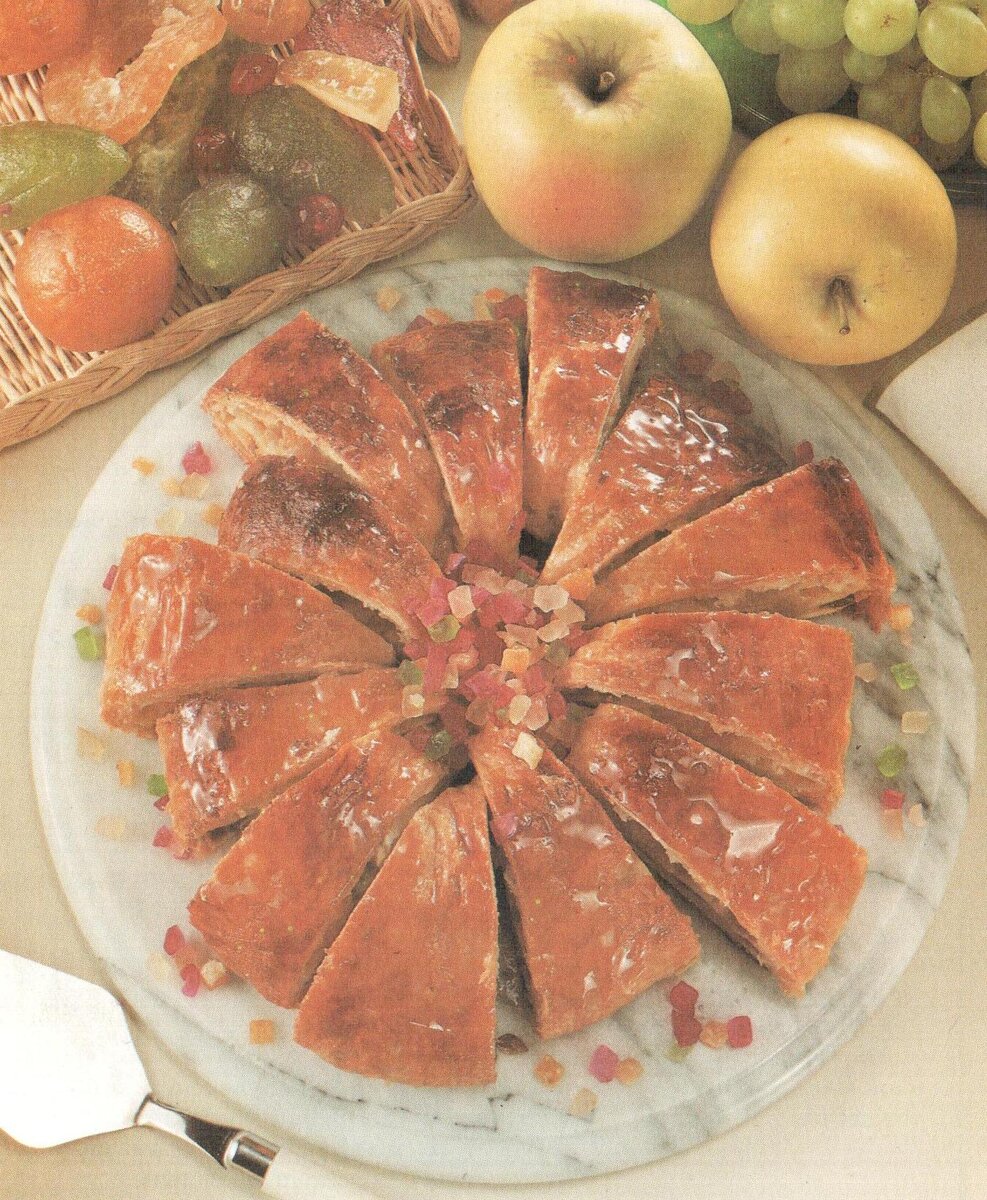 Торт из слоеного теста с начинкой изюма, миндаля и цукатов. Время приготовления: 40 мин. Время выпечки: 40 мин. Индигриенты: 400г слоеного теста ( замороженного) 150 г изюма 200 г миндальной крошки 250 г сахара 200 г разных фруктов, нарезанных 2 яйца тертая цедра 1 лимона 1 столовая ложка сахарной пудры Ликер по вкусу немного масла для выпечки Рецепт: Замочите изюм в ликере. Яйца слегка перемешать, 2 столовые ложки отложите в сторону. Миндаль, сахар,цукаты, изюм и цедру лимона смешать с испорченным яйцом. Раскатать тесто в прямоугольник 50 х 15 см и растушить на нем ледовую смесь (примерно 1,5 см по краю теста.) Свободно раскатать с длинной стороны прямоугольника. Разогреть духовку до 200 ° C. Перед полным раскатать свободный край тесто-прямоугольника с замученным яйцом обрызгать. Сложите тесто-ролики в кольцо. На смазанный маслом противень, с verquirltem Яйцо bepinseln и около 40 мин. выпекать. Посыпать сахарной пудрой. Подавать порезанным.