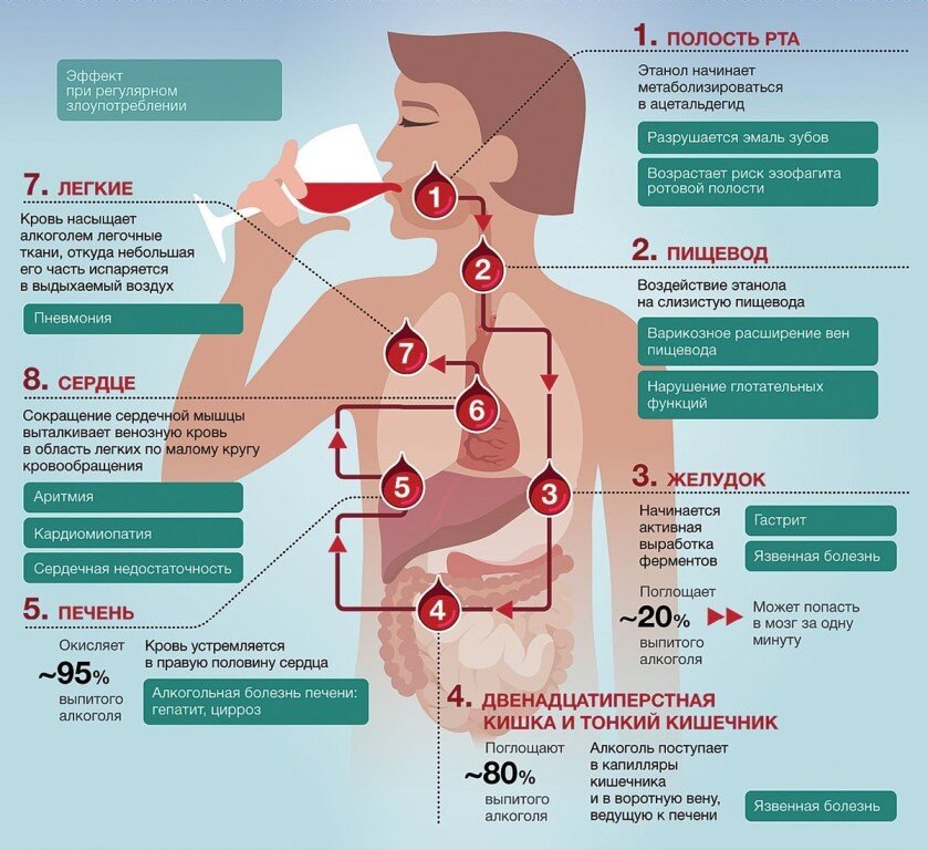 Друзья, давайте рассмотрим коротко действие этилового спирта (этанола) на организм человека. Независимо от поступления извне в тканевых жидкостях организма содержится 30-60 мг/л этанола, который считается нормальным продуктом обмена веществ у человека. При приеме внутрь этанол не участвует в пищеварении. С током крови он разносится во все органы, концентрируясь особенно в органах, богатых водой (спинномозговая жидкость может содержать этанола на 10% больше, чем кровь). При потреблении этанола с едой за счет разбавления он поступает в кровь медленнее, полностью выводится из организма и состояние опьянения переносится легче. В случае потребления этанола натощак опьянение наступает быстрее и достигает максимума. Небольшая часть этанола удаляется естественным путем, в том числе через легкие: в спокойном состоянии до 1%, при физических нагрузках — 5-10%. Через 12 ч этанол исчезает из крови, через 16 ч — из тканей тела. Большая часть потребленного этанола под действием ферментов