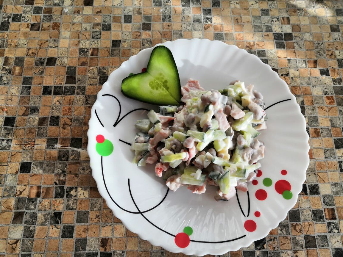 Сегодня праздничный, а завтра диетический Если копченую курочку заменить на вареную, а майонез на сметана+горчица+лимонный сок, то салат станет диетическим. В нем огромное количество белка, которого нам так не хватает. Вам понадобится: Копченой курицы 300гр Огурец свежий Майонез Фасоль 450гр Яйца 4шт Немного Сыра Наш салат готов! Приятного аппетита!