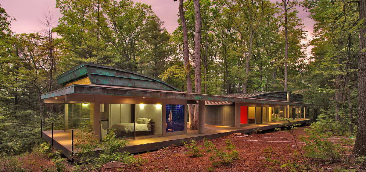 Этот современный загородный дом построен в живописном лесном окружении недалеко от Беркли Спрингс. Сохранение природы и единение с ней — вот главная задача этого проекта. Дом одноэтажный и максимально остеклён, пропуская лес вовнутрь, причём не только визуально, но и буквально — деревья, попавшие на пятно застройки, были сохранены и стали частью архитектуры. Сам дом состоит из двух частей — главной и гостевой. Обе части находятся под единой крышей и разделены крытой террасой. Название: Резиденция Хейес (Hayes Residence)