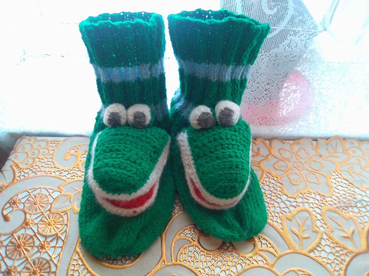 Носки на двух спицах связать очень легко и просто. Данным способом вязания, сможет даже новичок. Нам понадобится: - спицы; - крючок №4; - пряжа разных цветов. Носок будем вязать спицами. Начнем вязание с резинки. Набираем на спицы 48 петель и вяжем 12 рядов. Вяжем две изнаночных и наоборот. Затем добавляем голубую пряжу, вяжем шесть рядов. Опять девять рядов из зеленой, шесть из голубой и шесть из зеленой. Отсчитываем 12 петель для вязания пятки, вяжем вниз 24 ряда. Затем отсчитываем 9 петель по бокам, вяжем 12 рядов к низу. Ориентируемся по фото. Связываем крючком две стороны между собой. Начиная от пятки набираем 45 петель и вяжем вкруговую 40 рядов двумя спицами. Последующие три ряда убавляем через две петли. Далее будем вязать крючком. Четыре детали из зелёной пряжи и четыре из красной. Набираем 17 воздушных петель, вяжем 14 рядов и два через одну петлю. Соединяем детали и вяжем посередине один ряд из зеленой пряжи и два из белой. Наполняем деталь наполнителем. Детали из красной