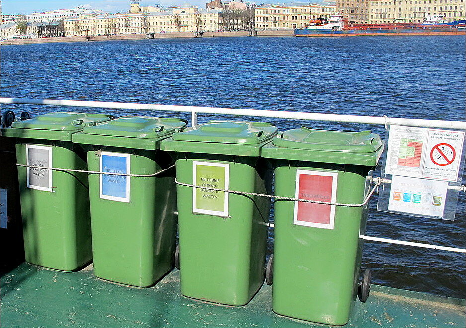На судах река-море, где довелось поработать, такого оборудования не было. Поэтому на корме устанавливаются вот такие контейнеры - отдельно для пластика, отдельно для пищевых отходов, ветоши и бытового мусора.