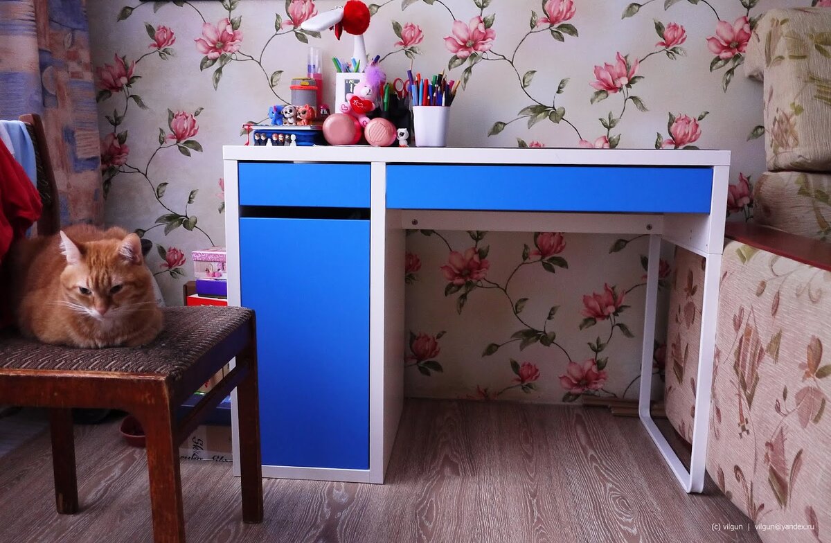 Серия письменных столов MICKE от IKEA - это серия столов разного размера, типа и назначения. Например вот такой стол для школьника. Очень удобный, в нем много полок, чтобы спрятать учебники и школьные принадлежности. По длине такой стол оптимален для одного человека.