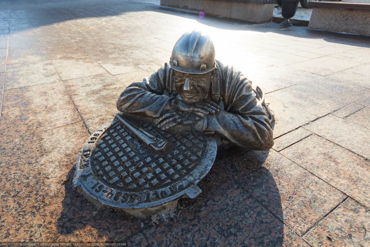 Омск! Говорят, его невозможно покинуть... Та еще глупость, тысячи людей каждый день приезжают и покидают его. Я бы сказал, что Омск, это город, который невозможно не полюбить. Утверждение столь же спорное как первое, но с моей точки зрения более верное! Как можно не любить город, в котором есть Степаныч? Сантехник Степаныч – знаковая фигура. Не то, что бы я питал особую страсть к сантехникам, но ещё, этот памятник иногда называют памятником диггеру. Канализация, люк, каска, разве что ключ газовый, а не разводной выбивается из общей концепции. Конечно, возраст у сантехника тоже повыше, чем у среднестатического городского исследователя, но есть диггеры и постарше Степаныча. Поэтому, для меня, в некоторой степени это памятник тоже является профессиональным. Да и в любом случае, я питаю глубокое уважение к данной профессии так как не понаслышке знаю где в каких условиях и с чем, им порою приходится работать! Памятнику этому, уже больше двадцати лет. Установлен он в 1998 году по распоряжен