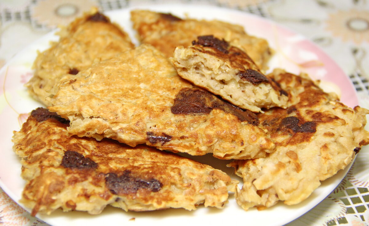 Рецепт: Ингредиенты: Яблоко - 1 большое или 2 маленьких, овсяные хлопья - 2 ст.л., рисовая мука - 2 ст.л., кефир - 4 ст.л., яйцо - 1 шт., горький шоколад - по вкусу, разрыхлитель - 1 ч.л., корица - по вкусу. Приготовление: 1. Яблоко очистить от кожуры и натереть на крупной терке. 2. К яблоку добавить яйцо, муку, овсяные хлопья и кефир, и все перемешать. 3. Горький шоколад измельчить ножом, но не сильно. 4. К смеси теста добавить горький шоколад, разрыхлитель и корицу. Все перемешать. 5. Мы выпекали в мультипекаре по 10 мин. каждую партию. Можно пожарить на сковороде по 5-7 мин. с каждой стороны. Приятного аппетита!